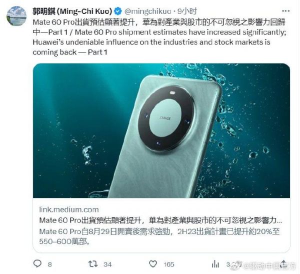 郭明錤预计华为Mate60 Pro一年内至少卖1200万部