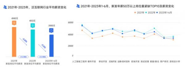 《报告》显示,近3年,泛互联网行业新发岗位的平均薪资呈现略微下降的走向。从2021年的40402元下降为39905元。然而,在年薪50万以上的从业者人群中,硬件开发、移动开发、前端开发等核心技术人员,依然取得薪资三连涨。