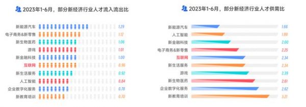 《报告》显示,2023年上半年互联网行业求职难度创新高,人才供需比持续上升,达到2.34,平均约5个人才竞争2个岗位。同时,互联网行业出现明显的人才溢出现象,人才流入流出比为0.96。52.31%的从业者转行进入其他领域,其中,转去电商零售行业的人才占比最高,为12.83%,其次是新生活服务行业(6.63%)和游戏行业(6.44%)。