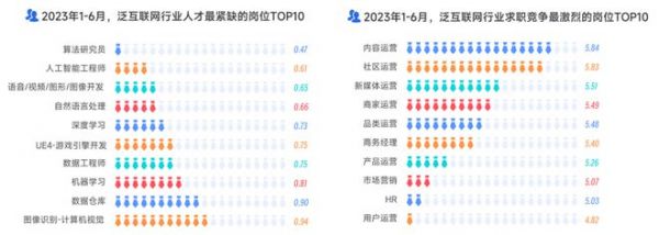 此外,2023年上半年,泛互联网行业最紧缺的岗位主要集中在AI方向,运营岗位人才求职竞争激烈。算法研究员以0.47的人才供需比位居人才紧缺度榜首,平均2家公司争夺1位人才。相比之下,互联网行业运营人才求职竞争白热化,内容运营、社区运营、新媒体运营成为求职竞争最激烈的TOP3岗位,平均5个人才竞争1个岗位。