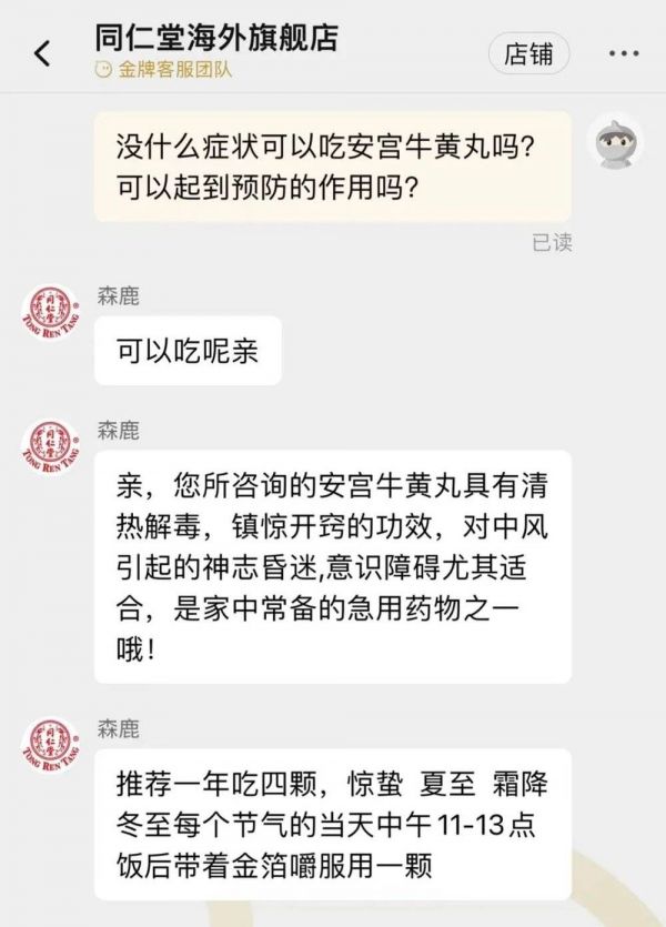 时代周报记者以消费者身份在电商平台询问多家药企关联店铺“没症状是否可以服用安宫牛黄丸?”“能否起到预防的作用”等问题。部分商家回复称:“安宫牛黄丸是传统中医急救药物,没有研究证实可以起到保健作用”,也有药企店铺客服的回答存在夸大药效的嫌疑。