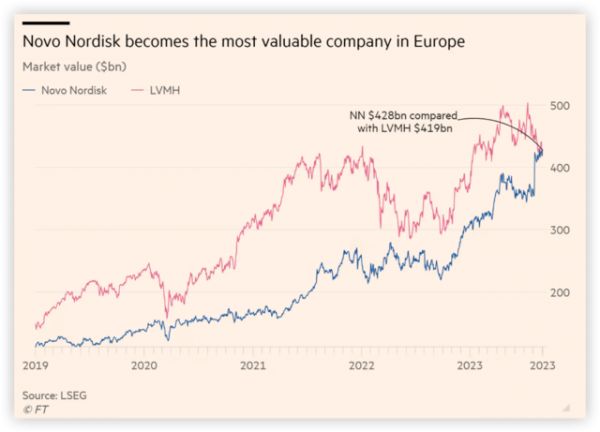 本周一,在诺和诺德减肥神药Wegovy进入英国市场这一消息刺激下,诺和诺德股价收盘上涨0.7%,市值达到4280亿美元。而奢侈品巨头LVMH集团股价则收跌0.4%,市值约为4190亿美元。减肥药终于战胜大牌包,稳居欧股市值第一宝座。