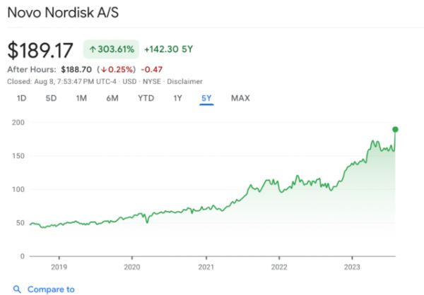 诺和诺德作为一家专门从事糖尿病护理的丹麦制药商,在过去三年里凭借横扫欧美的“减肥神药”——Wegovy(司美格鲁肽的减肥版本)等一系列产品赢得了市场的关注。自2020 年底以来,诺和诺德的股价已上涨两倍,超过了雀巢和阿斯麦等欧洲大型企业,跃居欧洲市值第二。