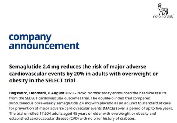 8月初的时候,诺和诺德公布了司美格鲁肽(semaglutide)在SELECT临床3期试验的结果。