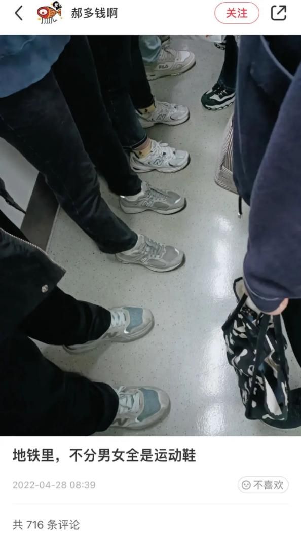 再回看挤满打工人的通勤工具:地铁或公交,无论你是穿着职业装还是休闲装,脚下永远是清一色的运动鞋。