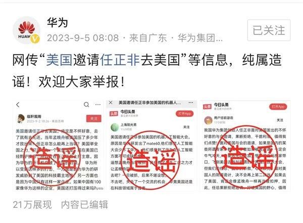 网传“美国邀请任正非去美国” 华为回应:纯属造谣
