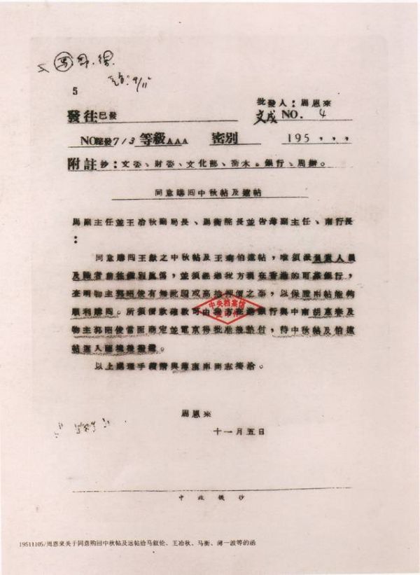 同意购回王献之《中秋帖》及王珣《伯远帖》。唯须派负责人员及识者前往鉴别真伪,并须经过我方现在香港的可靠银行,查明物主郭昭俊有无讹骗或高抬押价之事,以保证两帖能够顺利购回。所需价款确数可由我方在港银行与中南胡慧春及物主郭昭俊当面商定并电京得批准后垫付,待《中秋帖》及《伯远帖》运入国境后拨还。以上处理手续请与薄南两同志接洽。