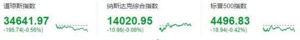 道琼斯指数收于34641.97点,下跌195.74点,跌幅0.56%;标准普尔500指数收于4496.83点,跌幅0.42%;纳斯达克指数收于14020.95点,跌幅0.08%。
