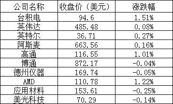 芯片龙头股多数上涨,台积电、高通和AMD涨幅超过1%。