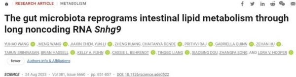 [1] Yuhao Wang et al., The gut microbiota reprograms intestinal lipid metabolism through long noncoding RNA Snhg9. Science (2023) Doi: 10.1126/science.ade0522