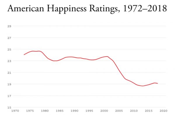 在稳定地发展了几十年之后,美国人的幸福感从那一年开始下降,虽然幅度不大,但确实如此。美国幸福指数的图表如下所示:从20世纪70年代开始,一条相对平稳、基本上幸福的曲线在千禧年左右陷入低谷。