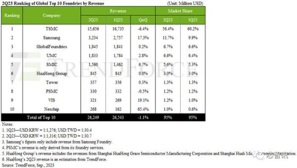 2023Q2全球十大晶圆代厂商:中芯第五,华虹第六,晶合第十!