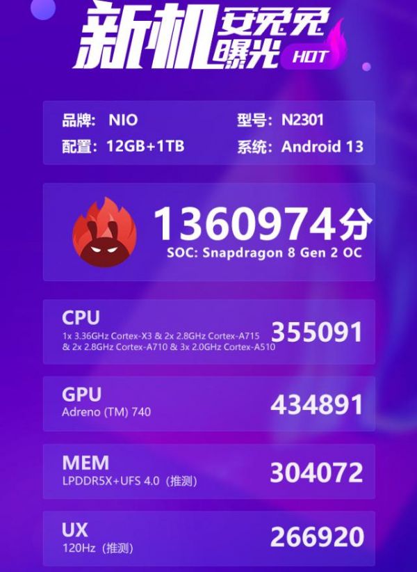 图源:网络此前,蔚来手机此前已经现身跑分平台安兔兔,该机型取得了总分 1360974 分、CPU 成绩 355091 分、GPU 成绩 434891 分、MEM 成绩 304072 分、UX 成绩 266920 分的成绩。从参数来看,蔚来这款用于跑分测试的手机大概率搭载骁龙8+Gen1处理器,但不排除量产机更新为骁龙8Gen2的可能。