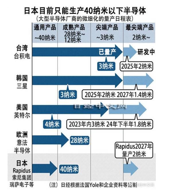 图源:日经中文网《日经中文网》表示,想要生产2nm芯片,他们必须跨越制造技术开发、获得国内外客户、确保总额5万亿日元的巨额资金这三大障碍。技术方面:日本国内只能生产40nm的产品,一下子跳到2nm显然困难重重;客户方面,当前的半导体代工领域被台积电、三星还有英特尔等企业占据,日本Rapidus公司面对这些巨头毫无胜算;资金方面,Rapidus公司想生产2nm芯片需要准备5万亿日元资金。