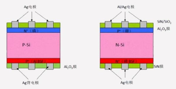 (图表:P型电池(左)和N型电池(右)结构示意图)