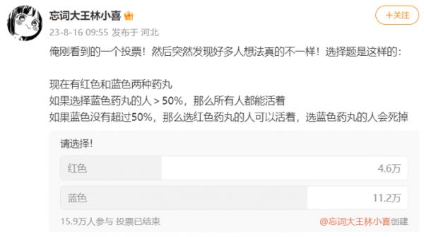 如果选择蓝色药丸,需要大于50%的人选择蓝色药丸,你才会存活,否则你会死去”。