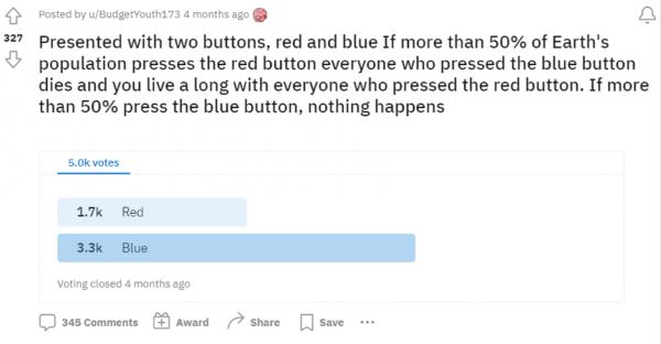 [1]https://www.reddit.com/r/WouldYouRather/comments/12xua1r/presented_with_two_buttons_red_and_blue_if_more/