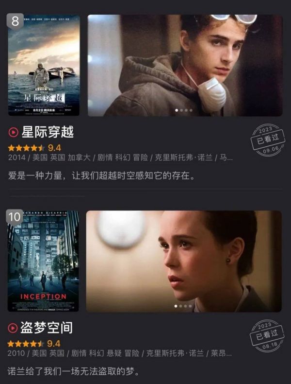 在豆瓣TOP250里,诺兰电影有6部电影位列其中,其中,《星际穿越》《盗梦空间》位居TOP10。
