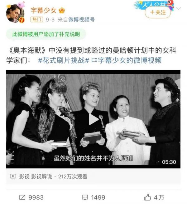 在《奥本海默》相关话题讨论里,诺兰忽视女性科学家的事情,网友也表达了不满,微博热搜出现话题“奥本海默中没有提到的女科学家们”。面对市场的变化,诺兰需要注意到除了电影的创新,可能还有新的社会思潮涌现。