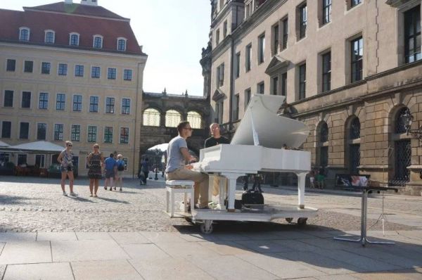 在这个难得的晴日,午后的太阳显示其威力。阳光下,广场上,一架白色的三角钢琴拖拽着长长的身影。琴师正奏出最后的和弦,一把铜号搁在琴台上,号手哪里去了?此时圣母教堂前,正有几个人手搭着凉棚往这边望。也许他们和我一样,有点懊恼来晚了,错过了钢琴演奏?在德国,无论大小城市,街头常有古典音乐演奏,乐队的演奏水平很高,人们驻足倾听,一曲完毕,心悦诚服地奉上金钱。然而,在街头演奏三角钢琴并不多见。这架三角琴让我感觉德累斯顿古老又时髦。