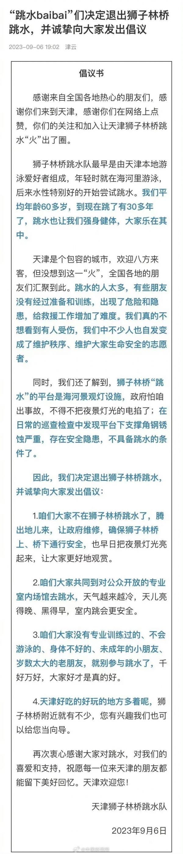 就在刚刚,狮子林桥跳水迎来大结局。天津狮子林桥跳水队发布倡议书,天津baibai决定退出狮子林桥跳水,倡导大家到室内场馆训练,并热情表示“来天津玩,我们当向导”。