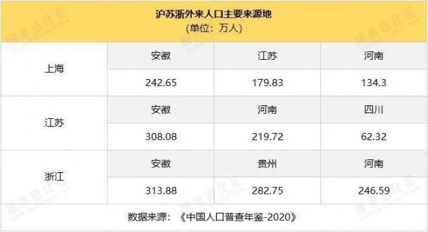 而在皖籍人口流出地中,排名位列前三的正是同处长三角的浙江、江苏、上海。反过来,安徽也是这两省一市共同的第一大外来人口来源地。足见其作为“腹地”的重要地位。