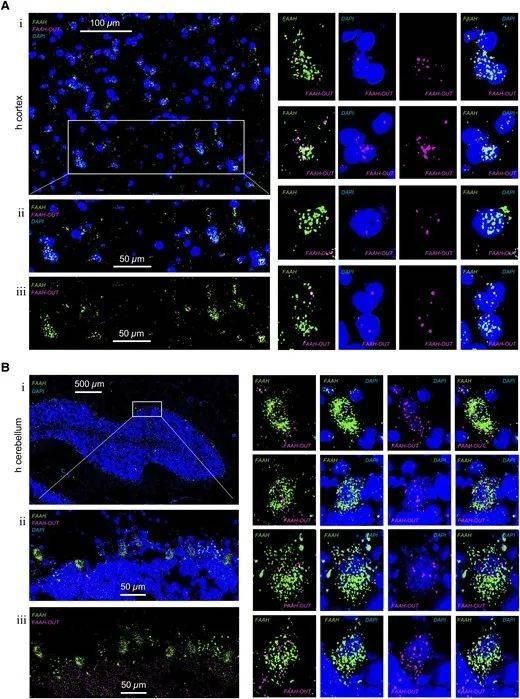 (A) Faah和 Faah-out RNA 表达水平和在人大脑皮层细胞中的定位。通过RNAscope测定分析新鲜冷冻大脑皮层(7-10μM 厚)的切片,将 Faah mRNA(绿色,AF488)的定位与 Faah-out lncRNA(洋红色,Opal650)定位和指示细胞核位置的 DAPI 染色(蓝色)进行比较。比例尺为白色。代表性区域 (i) 和由白框指示的放大子区域显示绿色 (Faah) 和洋红色信号 (Faah-out) 与相同细胞 (ii 和 iii) 的共定位。右侧显示了表达 Faah mRNA(绿色)和 Faah-out lncRNA(洋红色)的单个细胞的放大图。