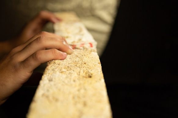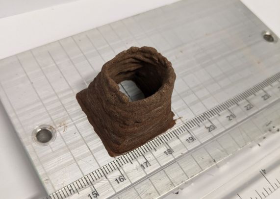 町田光太认为日本每年产生大量食物垃圾,这是一个必须解决的大问题。他们将粉末状食物残渣与水混合,然后在高温(50至150摄氏度)下将其压入模具中,制造材料。这种材料的强度是混凝土的四倍。如果不进行防水处理,材料就会受潮变软,会被唾液软化。酒井补充道,这种材料保持了原始食物的气味,研究小组甚至还添加了调味料。