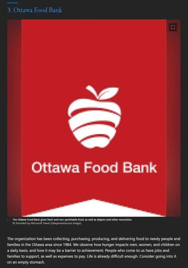 实际上,“渥太华食物银行”是一家慈善救助机构,在当地为无法果腹的人们提供食物救助。很显然微软将其列为“旅游景点”是个离谱的决定。