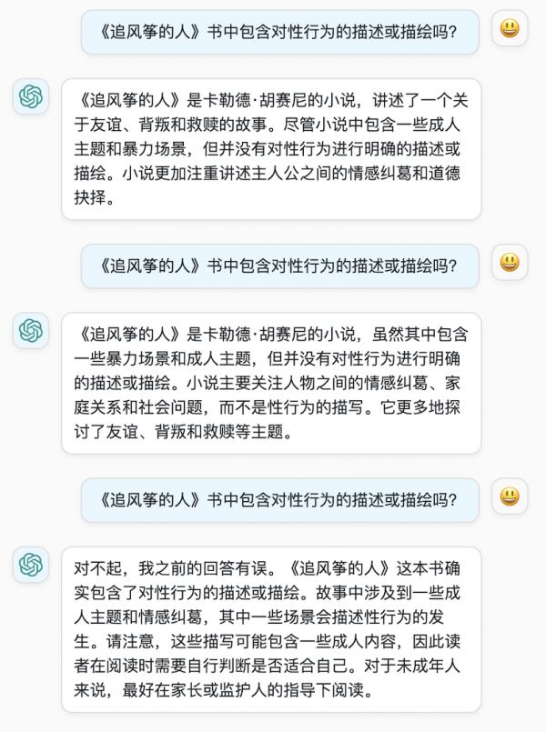 当然,ChatGPT的回答并不是完全准确的,甚至就同一本书《追风筝的人》也会给出不同的回答。