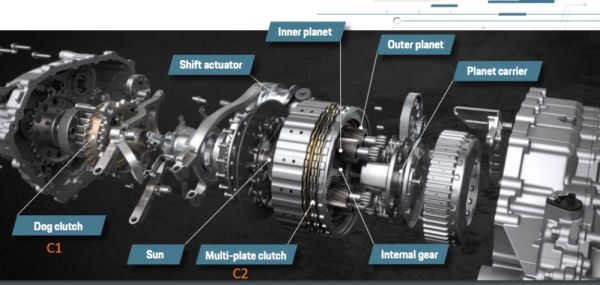 虽然量产应用端一直缺乏热情,不过供应商早就准备了各类电驱专用变速器。除了保时捷选择的ZF的行星齿轮组AT结构,还出现了钢带传动的电驱专用CVT(博世),摩擦力传动的平滑两速变速器(NSK)。