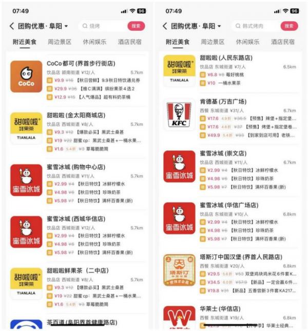 快手和小红书在县城中以学生用户为主,也让县城中的商家对运营小红书和快手的动力普遍不足。例如皖北界首市中的快手本地生活商家基本上都是以蜜雪冰城、茶百道、肯德基这种大型连锁餐饮商家为主,很少看到本地个体商户。