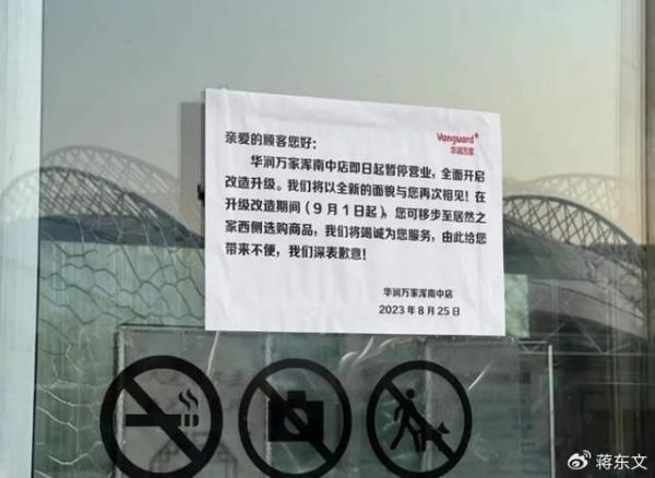 无独有偶的是,就在郑州华润万家秦岭路店关闭的同一天,沈阳浑南亿丰时代广场的华润万家超市也张贴出通知:华润万家浑南中店即日起暂停营业,全面开启改造升级。