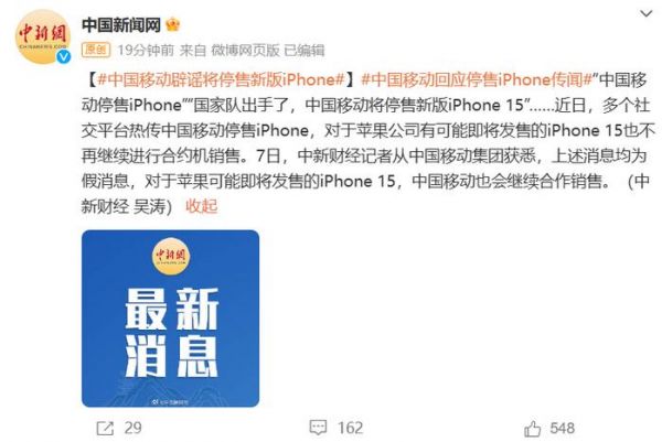今日,中国新闻网从中国移动集团获悉,上述消息均为假消息,对于苹果可能即将发售的 iPhone 15,中国移动也会继续合作销售。