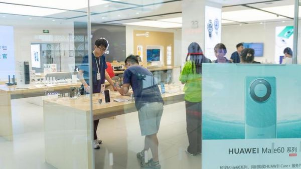 2023年9月5日,山东济南,华为专卖店。视觉中国 图从华为Mate60 Pro突然预售到线下门店排起长队,连日来,社会各界对这款国产手机的关注热度不减,其背后是对“中国芯”的期待,是对突破封锁的迫切,也是对科技自立自强的信心。