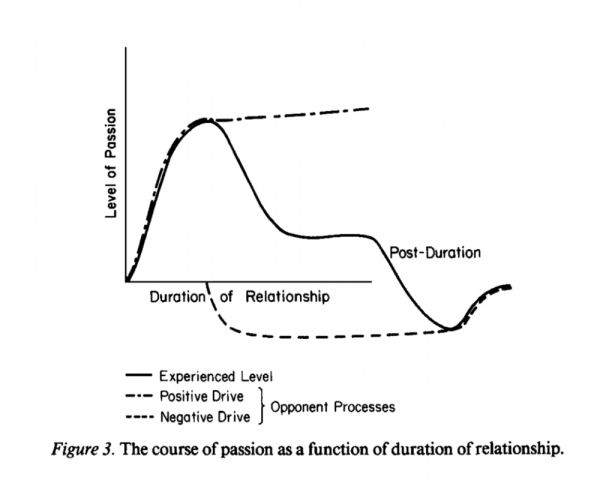 一开始激情的增长很快,甚至可以瞬间体验到,一旦对方做出回应,就会开始下降或者平缓,最终达到一个稳定的水平。但如果失去这个人,激情不光会下降到零(认识这个人之前所感受到的水平),甚至继续下降到零以下,导致抑郁、痛苦和极度不适,跌到谷底后随着时间开始慢慢缓和,人们才会最终回到零的状态。