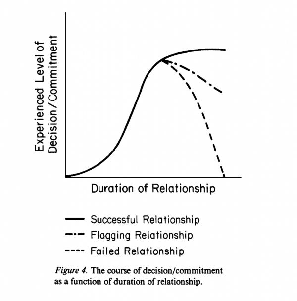 在一段关系里,承诺可能一开始渐进,然后逐渐加速,如果关系维持了很长时间,承诺会趋于平稳。如果关系出现问题,承诺会下降一段时间,修复成功后承诺可能会回升。如果关系失败,承诺会下降直到落回零的水平。