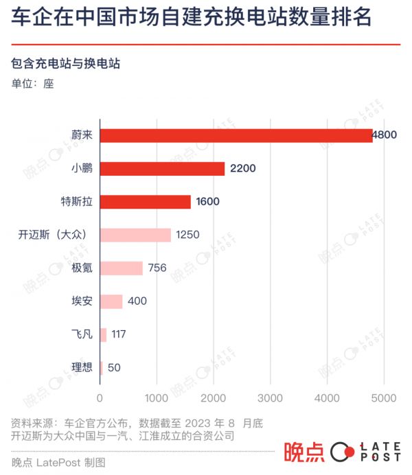 算上换电站和充电站,中国市场里,自有补能网络最大的车企是蔚来,它已建成 1800 个换电站和 3074 个充电站,共计 7368 台公共充电桩。蔚来之后,投入较多力量自己建站的品牌依次是小鹏、特斯拉、极氪和埃安。