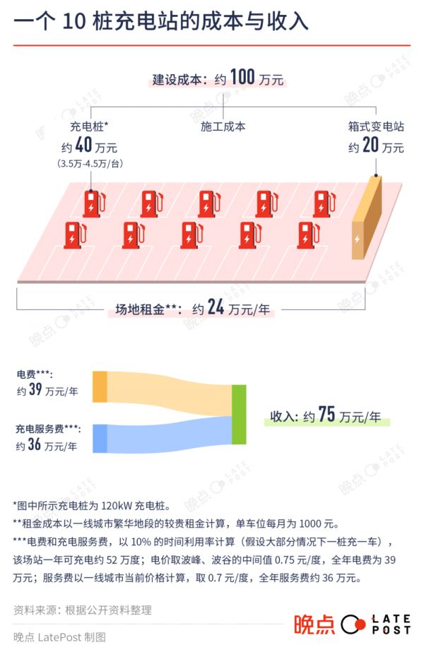 一个有 10-14 个 120 kW 充电桩,即 20-28 个车位的充电站(一个充电桩带两个充电枪,可同时充两辆车),目前的固定投资成本约 100 万元人民币。其中大头是设备采购成本。7 kW 的家充桩只需 1000 元-2000 元,而 120 kW 的公共充电桩,目前采购价约 4.5 万元人民币。中国两家最大的充电桩运营商,特来电和星星充电都是自己研发和生产充电桩,成本可控制在约 3.5 万元,这样 10 个桩就是 35 万-45 万元。每个站还需配备一个箱式变电站,其售价约为 20 万元。