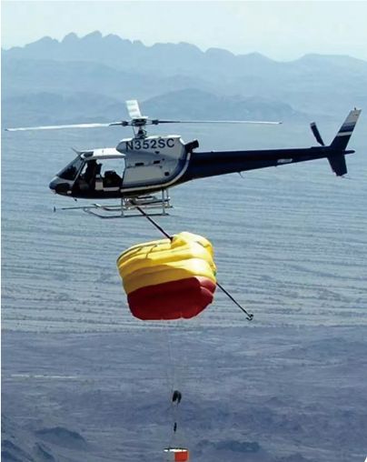 此外,基于翼伞系统在近地面稳降阶段具备稳定水平速度滑翔的特点,可以采取空中回收的方式,利用直升机跟飞并捕获翼伞系统,从而对航天器实现无损回收。图3为美国“起源”返回舱采用空中回收方案的验证场景。