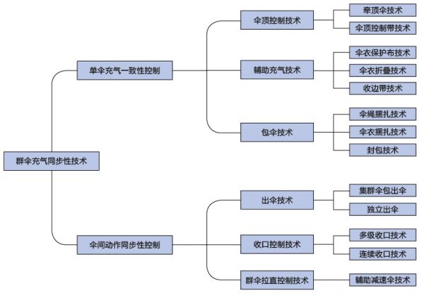 群伞充气同步性控制也是非常重要的环节,主要从提高单伞的充气一致性和提高伞间动作的同步性两方面采取措施,主要可采用伞顶控制带控制拉直充气和多级收口分段充气等方案,如图9所示。