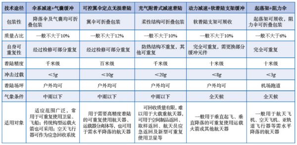 对国内外各类可重复使用航天器的现状、系统方案及发展趋势进行分析可以发现,可采用的回收着陆系统方案主要有5类,包括伞系减速+气囊缓冲、可控翼伞定点无损着陆、充气附着式减速着陆、动力减速+软着陆支架缓冲、起落架+阻力伞。此外,还有采用旋翼进行减速等其他方案,但研究及应用很少,本文不作叙述。