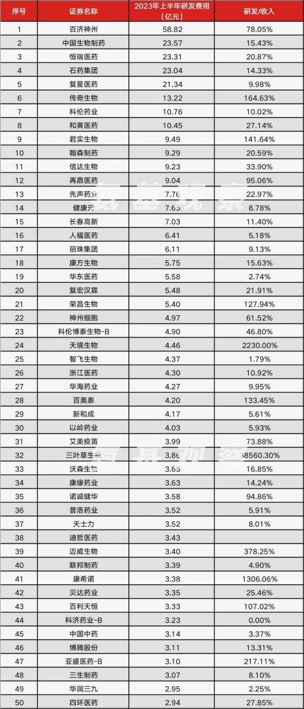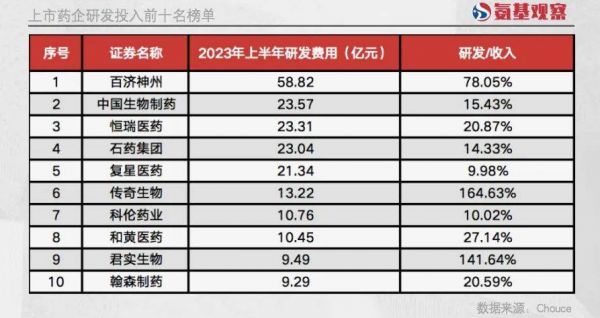 在百济神州之后,中国生物制药、恒瑞医药、石药集团、复星医药分列第2~4名,研发投入分别为23.57亿元、23.31亿元、23.04亿元、21.34亿元。