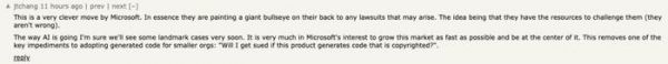 正如网友所评价的,「微软的这一举动非常聪明。从本质上讲,他们是在自己的背上画了一个巨大的靶心,以应对可能出现的任何诉讼。他们的想法是,他们有足够的资源来挑战他们(他们没有错)。从人工智能的发展趋势来看,我相信我们很快就会看到一些具有里程碑意义的案例。尽可能快地发展这一市场并成为其中心,这非常符合微软的利益。这就消除了小型公司采用生成代码的主要障碍之一:"如果这个产品生成的代码受版权保护,我会被起诉吗?」