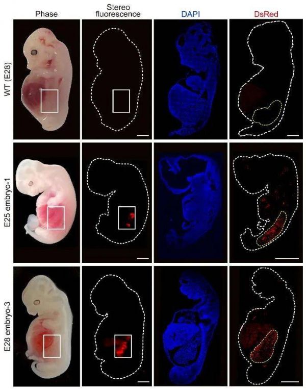 ▲胚胎中的人源肾脏细胞(红色荧光区域)(图片来源:参考资料[1])