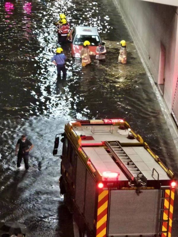情况一度危急,小雪看到,7日晚上,香港红磡海滨南岸小区附近,天桥下的隧道积水淹没了的士,警车和消防车都出动救援。