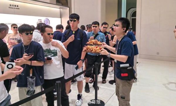 华为门店排队人数太多,2小时后店员开始发炸鸡水果……
