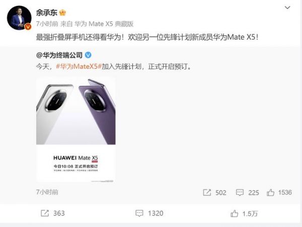 华为常务董事、终端BG CEO、智能汽车解决方案BU CEO也发微博表示:“最强折叠屏手机还得看华为!”