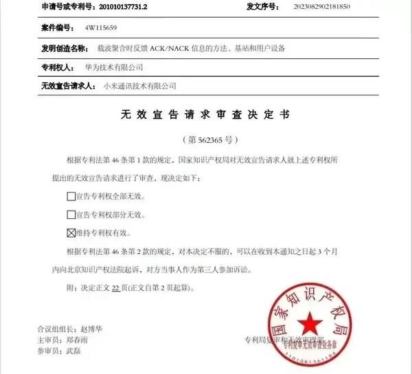 小米申请华为四项专利无效案结果公布 维持专利权有效