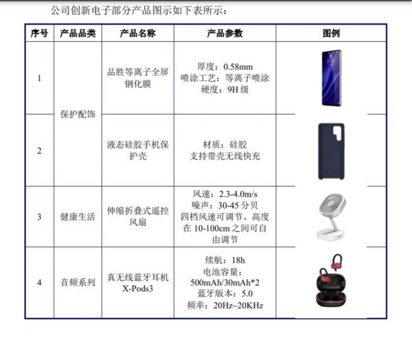 创新电子业务的范围广一些,但也是围绕手机发展的,主要包括手机壳、手机钢化膜和蓝牙耳机等。